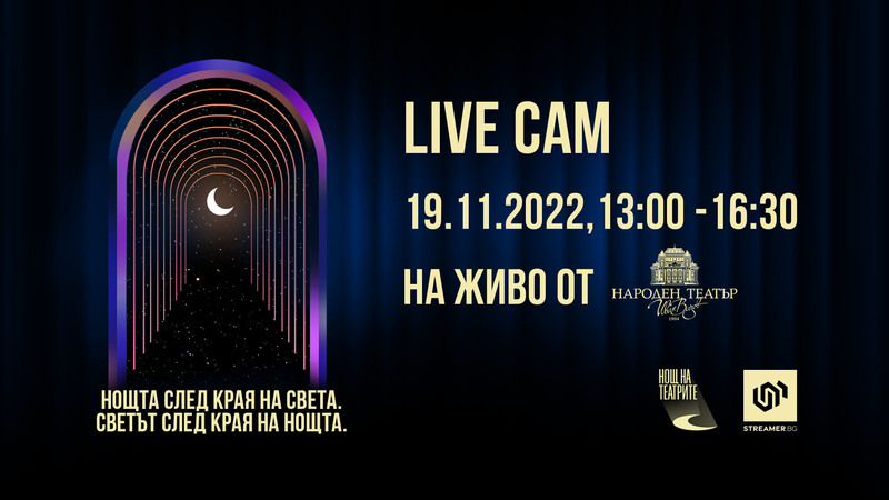 Точно в 13 ч. на 19 ноември ще бъде открит LIVE CAM-ът на европейската инициатива Нощ на театрите. 4-часовото онлайн предаване е под наслова “Нощта след края на света. Светът след края на Нощта“ и ще се излъчва на живо във фейсбук за всички почитатели на театралното изкуство в България и по света.